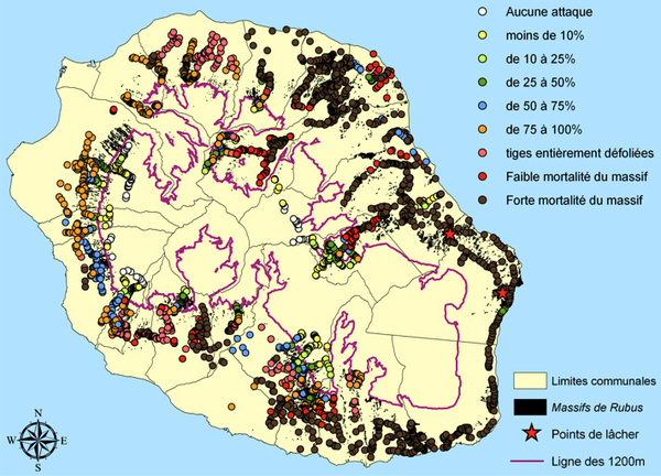 Surveys show that by 2012, the sawfly had spread around the island since it was first observed in 2008. It is now present in all lower-altitude areas of the island, but densities are lower than in previous years. In the east of the island, Cibdelajanthina is still present despite the scarcity of Rubus alceifolius, which has been virtually eliminated in the sectore xtending from St. Benoit to St. Joseph. Any remaining shoots are rapidly consumed by sawfly larvae. The summer and winter surveys have shown that lower temperatures at higher altitudes strongly influence populations of C.janthina and their impact on R. alceifolius. A thesis was began in late 2011 to identify and model the long-term balance between the sawfly and the giant bramble, at different altitudes.